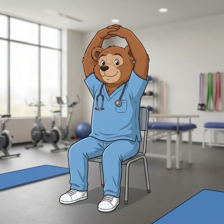 椅子に座ったまま、両手を頭の上で組み、ゆっくり上に伸ばします。